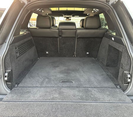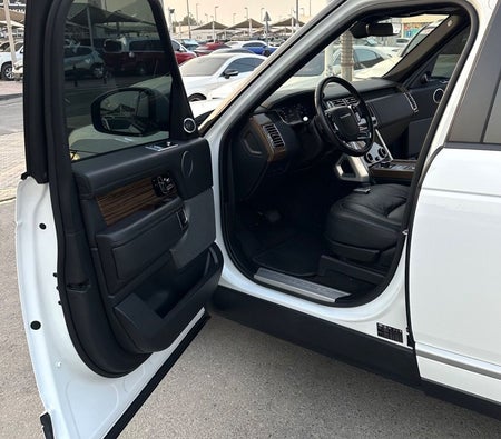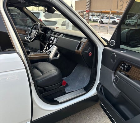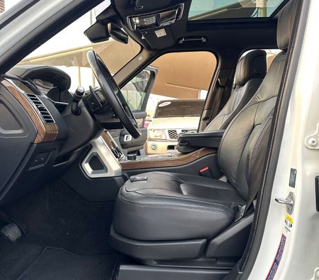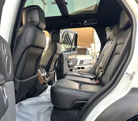 Range Rover Vogue Supercharged 6cylinder Gulf, number one, full specifications, panoramic, leather, large screen, camera, fingerprint start, and blind spot. The car has only one piece of paint. The car is white with a black interior.