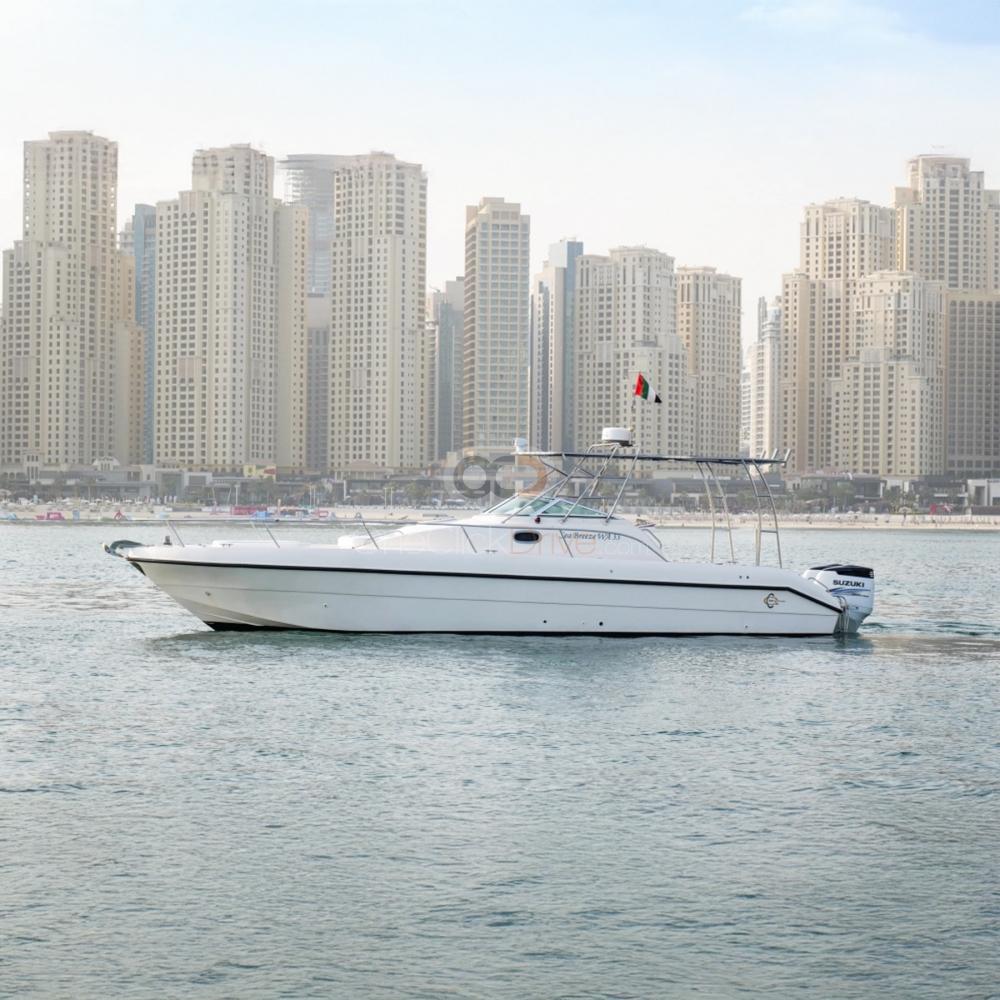 The Yacht is designed to provide a comfortable and luxurious experience for you and your guests while taking in the beauty of the surrounding scenery and exploring amazing attractions such as the sky-high Burj Khalifa, Atlantis Hotel, and man made Palm Jumeirah. With a length of 34 feet, this yacht can comfortably accommodate up to 10 guests. The boat also boasts an elegantly appointed interior, with plush seating and ample room to move around and socialize.